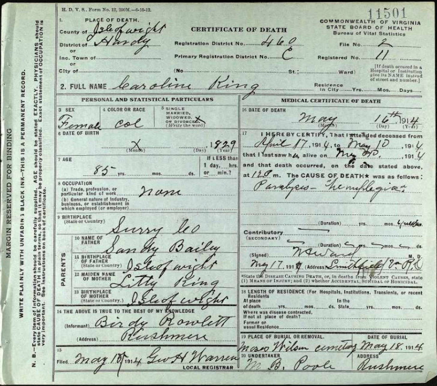 That answer lived about 200 miles away and had a 200-year story. The story of my beginning was born as Caroline King in 1829. Vital records and census data tell us a little bit about how others perceived her. Stories of the family, however, reveal more about how her people saw her. There is the story of Julian Derring, a confederate with whom she had a child, Mary Frances, the daughter, who was buried in the White cemetery. There is the story of the house that mysteriously caught fire, burning the family's wealth. There is another story about the decision point during the fire, where the choice was between saving a baby and saving money. There are stories of large feasts on the family land with a house on the road, and how it was such a big deal to have not just a home, but a house on the road. There are stories of hogs, a baseball diamond, and hangouts at Tyler’s Beach. There are stories about my grandmother singing to the sick people in the infirmary when she was a young girl. And playing with white children in the area and being friends until they learned how to treat black people in school. There was a story of starting a church on land that was passed down. There were families and clans that all lived in proximity with different surnames, including the Baileys, Blounts, Hills, Claggetts, Bradbys, and the Rowlettes.